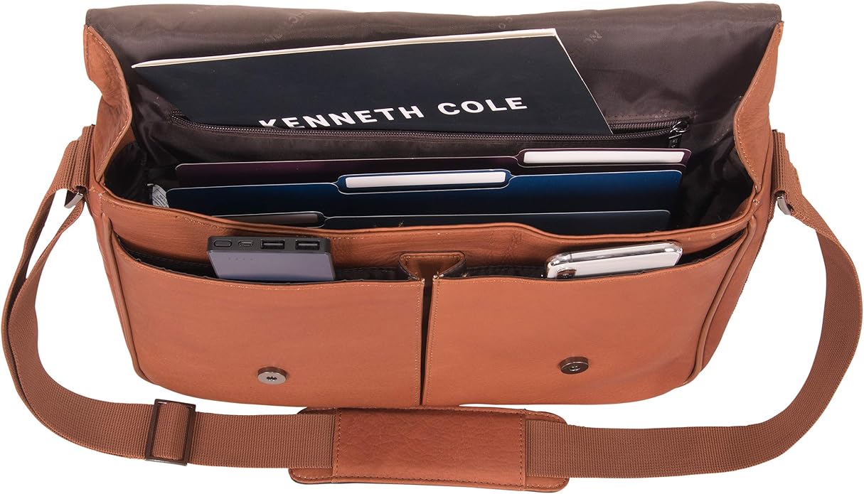 - Slim messenger bag construction with dual magnetic closures under the leather flap. Roomy main compartment can fit documents, everyday essentials, a laptop or tablet, and features a full-length zipper pocket. Rear exterior open pocket for easy-access to frequently needed items.