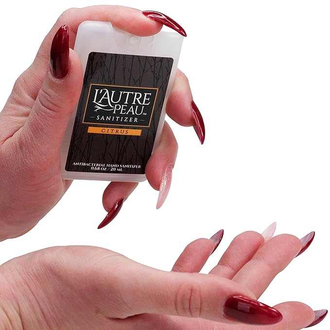 Antibacterial Travel Hand Sanitizer Spray with Aloe Vera by L’AUTRE PEAU - Unique Flat Credit Card Shape - Citrus Scented Mini Pocket Size (4 Pack - 20ML, Frost,Black,Red,Blue)