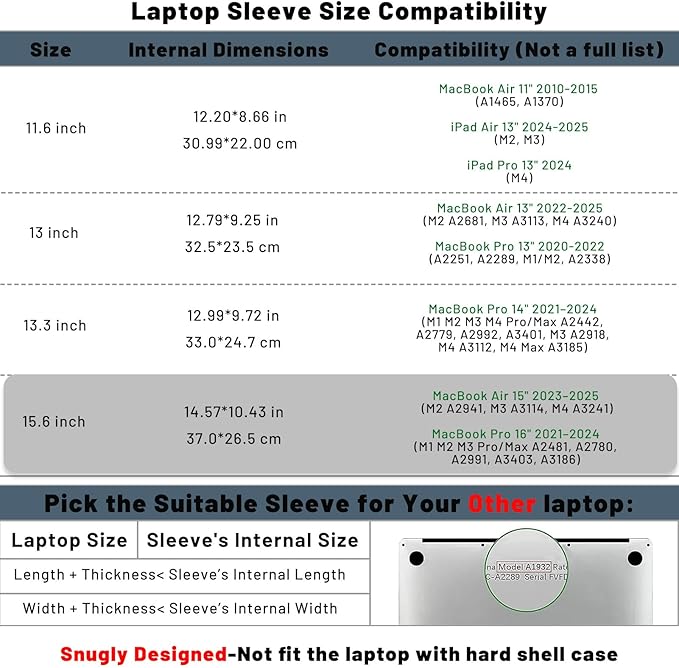 - Dimension: External dimensions: 15.35 x 11.02 x 0.2 inches. Internal dimensions: 14.57 x 10.43 inches. Please measure before purchasing. (The width and length of your laptop should be less than the internal width and of the sleeve). If the computer comes with a hard case, you will need to add the case dimensions to the measurement