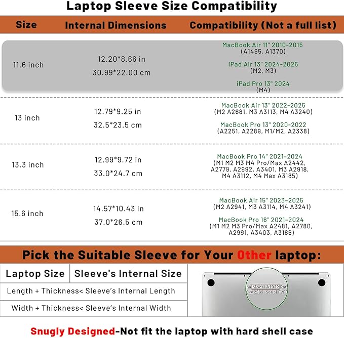 - Compatible Models: MacBook Air 11" 2010-2015 (A1370 A1465); MacBook 12" 2015-2017 (A1534, better with a hard shell); 2015-2017 iPad Pro 12.9"; also compatible with other brands of laptops. (The MacBook 12 fits loosely in the sleeve without a case; it fits better with a hard case)