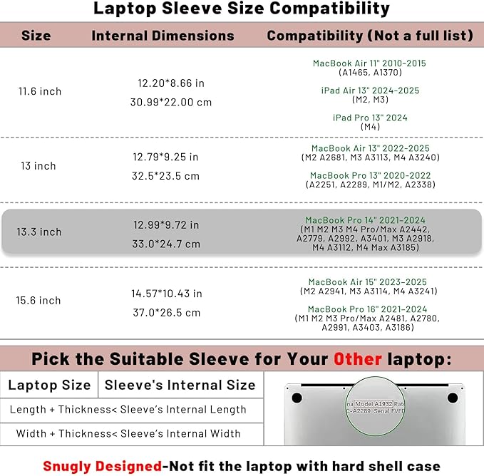 - Compatible Models: MacBook Air 13" 2010-2017 (A1466 A1369); MacBook Pro 13" 2010-2015 (A1502 A1425 A1278); MacBook Pro 14" 2021-2024 (M1 Pro/Max A2442, M2 Pro/Max A2779, M3 A2918, M3 Pro/Max A2992, M4 A3112, M4 Pro/Max A3401, M4 Max A3185). Also compatible with other brands of laptops