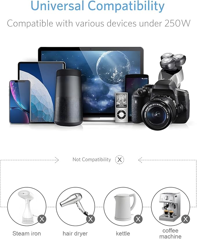 - BESTEK Travel Voltage Converter: Converts all countries voltage(100-240V,50/60Hz) to US voltage (110V,60Hz), ideal for charging your multiple devices when traveling abroad. 【Note: Not suitable for devices with power exceeding 250w, such as hair dryers, coffee maker, steam irons, kettles, juicers, etc.】