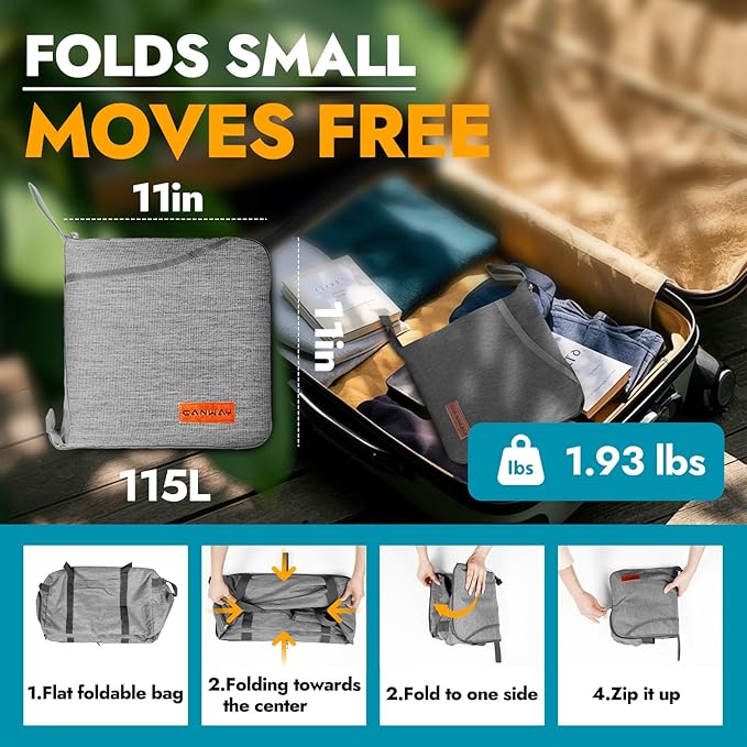 - LARGE FOLDABLE DUFFLE: It extends to 31.8 x 16.5 x 16.1 inch with 115 Liters capacity and 2.07 pounds. Folded Size:11 x 12.2 x 3.9 inch, easy to store. This duffle bag has one spacious main compartment and 6 separate pockets.Keep your belongings well organized