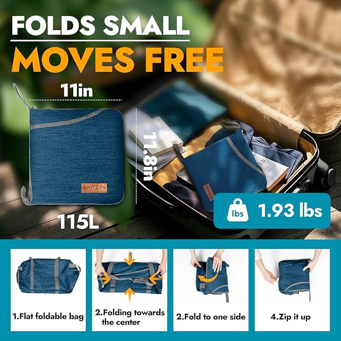 - LARGE FOLDABLE DUFFLE: It extends to 31.8 x 16.5 x 16.1 inch with 115 Liters capacity and 2.07 pounds. Folded Size:11 x 12.2 x 3.9 inch, easy to store. This duffle bag has one spacious main compartment and 6 separate pockets.Keep your belongings well organized