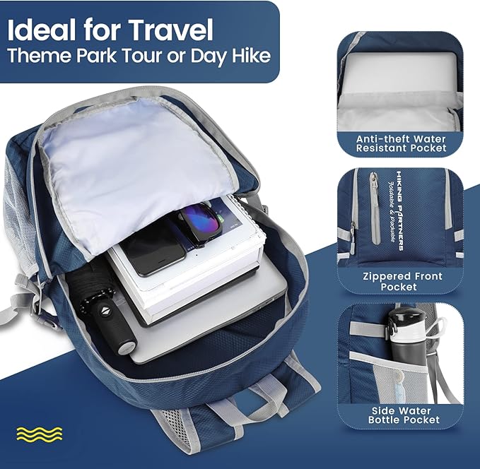 - Large Capacity Lightweight Foldable Backpack 35l: Our foldable hiking backpack capacity is 35L,with large capacity and many pockets.There is a main bag in the foldable daypack,and there are compartments in the main bag,which can be installed and clothes and washing products;There are 3 front bags that can store mobile small equipment.Two side bags store water bottles and umbrellas.There are protective buckle bands from the side bag to avoid the drop of umbrellas and water bottles