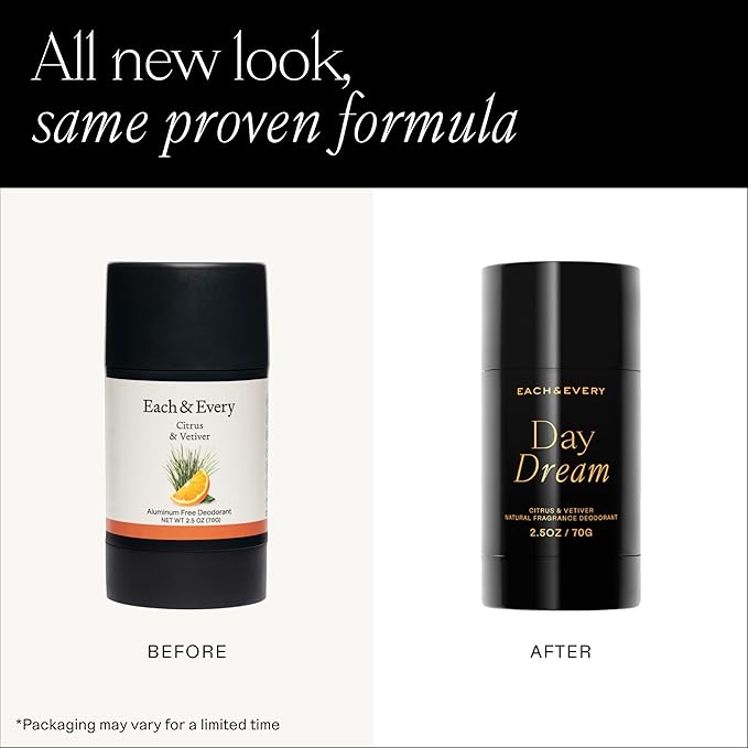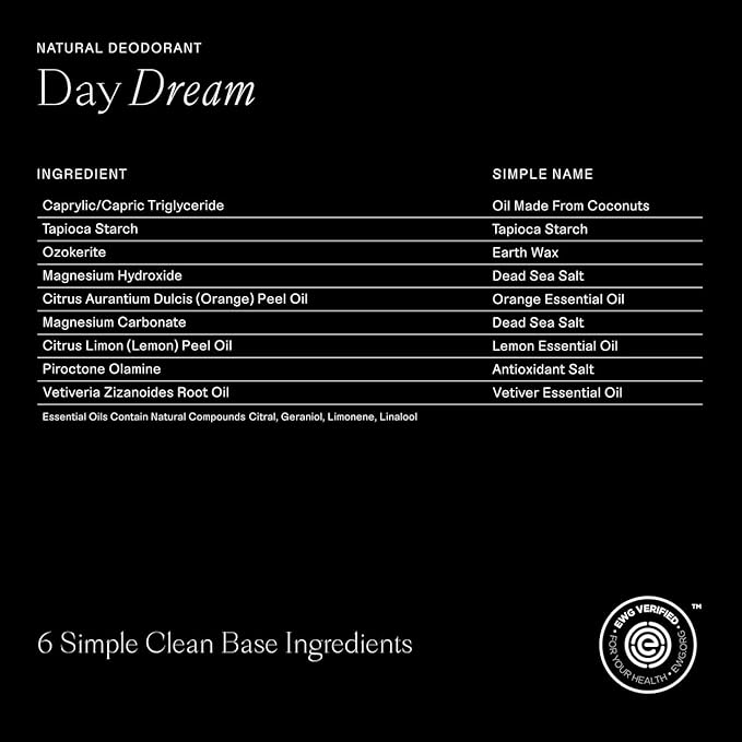 - Day Dream - Escape the ordinary with notes of earthy, grounding vetiver and bright, invigorating citrus. Meanwhile, plush tapioca starch and conditioning coconut oil give this sensitive skin deodorant a smooth glide.