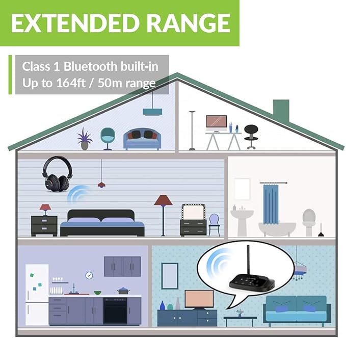 - 【Hassle-Free Set Up】 There’s no need to go through the complex Bluetooth pairing process; simply plug the HT5009’s transmitter dock into your TV’s audio output port, power on both the dock and the headphone, they’ll quickly connect with each other, and you should be good to go. Works brilliantly with older Non-Smart TVs as well.