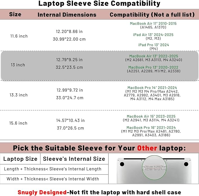 - Dimension: External dimensions: 13.19 x 9.84 x 0.2 inches. Internal dimensions: 12.79 x 9.25 inches. Please measure before purchasing. (The width and length of your laptop should be less than the internal width and length of the sleeve). If the computer comes with a hard case, you will need to add the case dimensions to the measurement