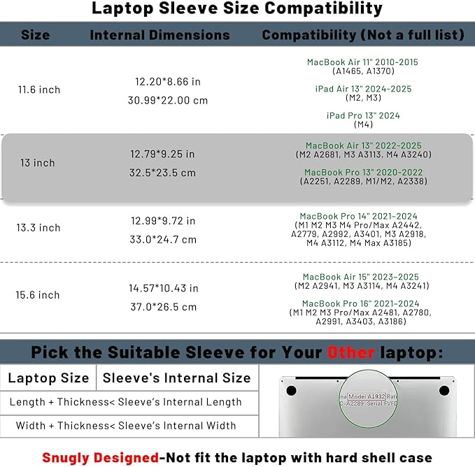 - Dimension: External dimensions: 13.19 x 9.84 x 0.2 inches. Internal dimensions: 12.79 x 9.25 inches. Please measure before purchasing. (The width and length of your laptop should be less than the internal width and length of the sleeve). If the computer comes with a hard case, you will need to add the case dimensions to the measurement