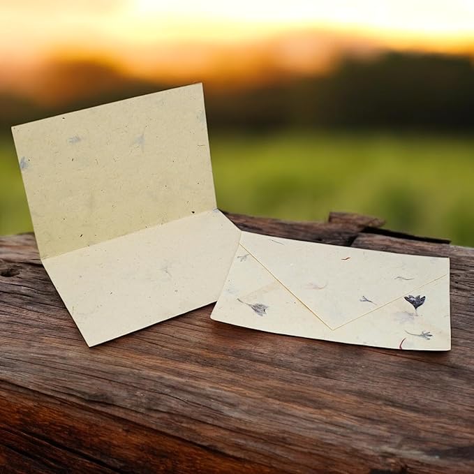 - HANDMADE DELUXE 25-CARD SET: 4x6 inch all-occasion cards (twenty-five total) with accompanying envelopes made following a 1,000-year-old paper-making process in Nepal and integrating real Cornflower petals.
