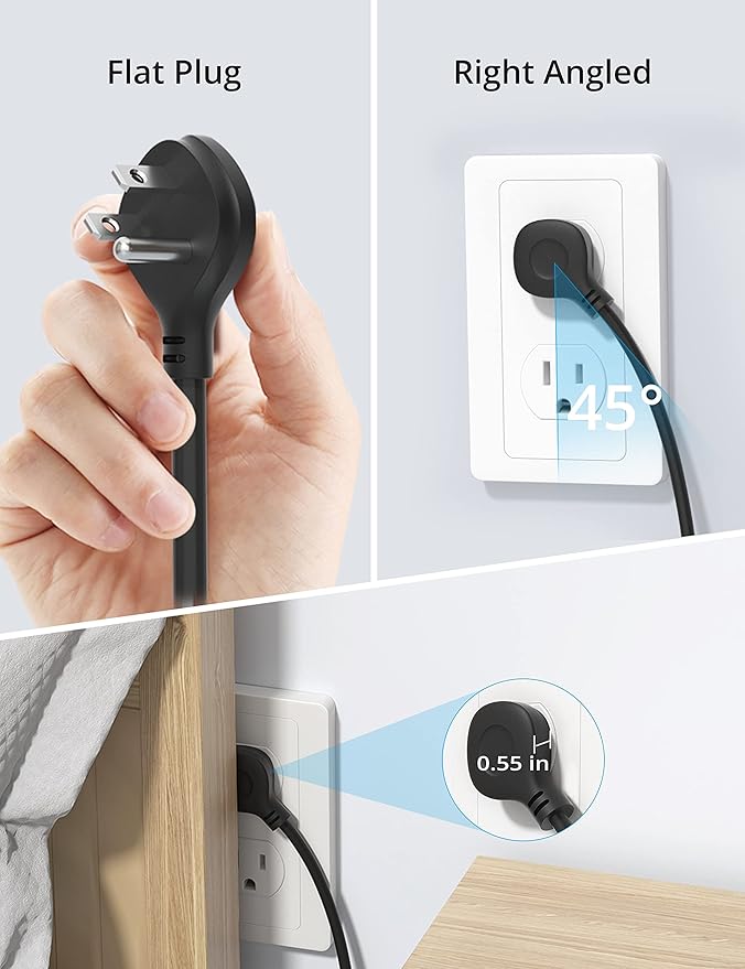 - Power Strip Flat Plug: This surge protector with usb ports is made with 14AWG pure copper, ensuring the 5-foot heavy-duty extension cord has superior current-carrying capacity (15A). The angled flat plug minimizes clutter and awkward cord placement while ensuring the bottom receptacle remains accessible