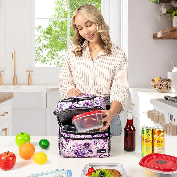 Opux Lunch Box For Women - Large Dual Compartment Insulated Lunch Bag, 10x7.5x10 Inches, Floral Purple