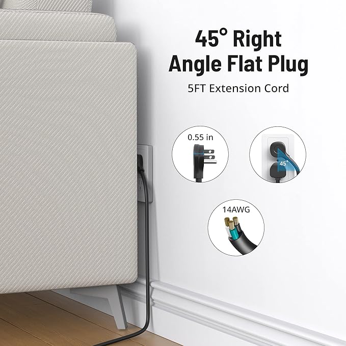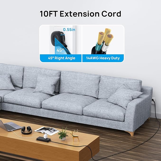 - 10ft Extension Cord Flat Plug: This surge protector is made of 14 AWG pure copper for extra durability, the 10ft extension cord is heavy duty and has better current carrying capacity (15a). The low profile right angle flat plug eliminates awkward cords from cluttering and doesn’t block the bottom receptacle
