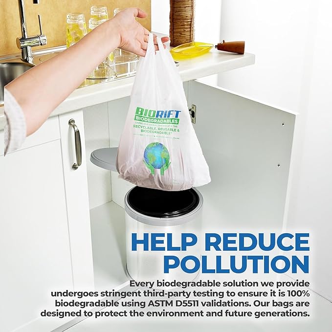 - 🌱 ASTM D5511 Validation of Biodegradability - BioRift's Eco-Friendly T-Shirt Grocery Bags are a standout choice for the environmentally conscious. These bags are validated by ASTM D5511, ensuring their biodegradability under specific landfill conditions. This validation provides consumers with reliable assurance that these bags are designed to break down naturally over time, minimizing their environmental impact.