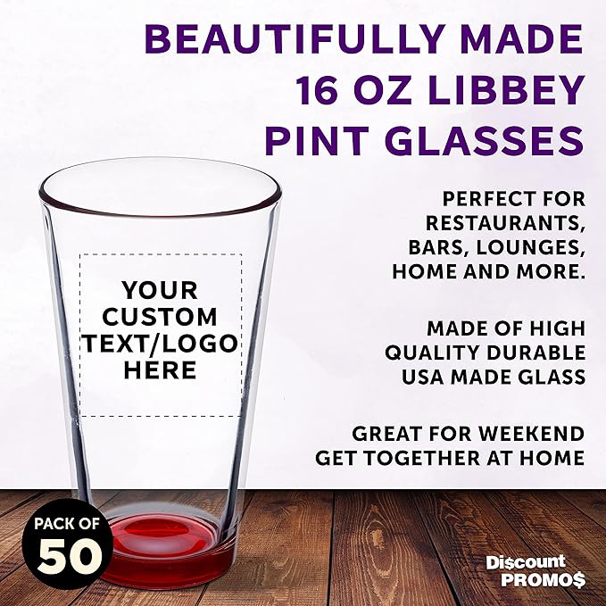 Custom Libbey Pint Glass 16 oz. Set of 50, Personalized Bulk Pack - Beer Glasses, Heavy Duty Drinkware - Red