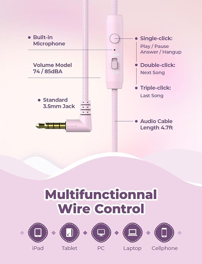 - [Built-in Mic & Great Compatibility]: iClever wired headphones work with the build-in HD microphone for hands-free phone calls. These over-ear headphones for kids support a wide range of devices with 3.5mm audio jack like Chromebook, Kindle Fire, Switch, iPad, Smartphone, MP3/4, Study Tablet, Laptop, PC etc.