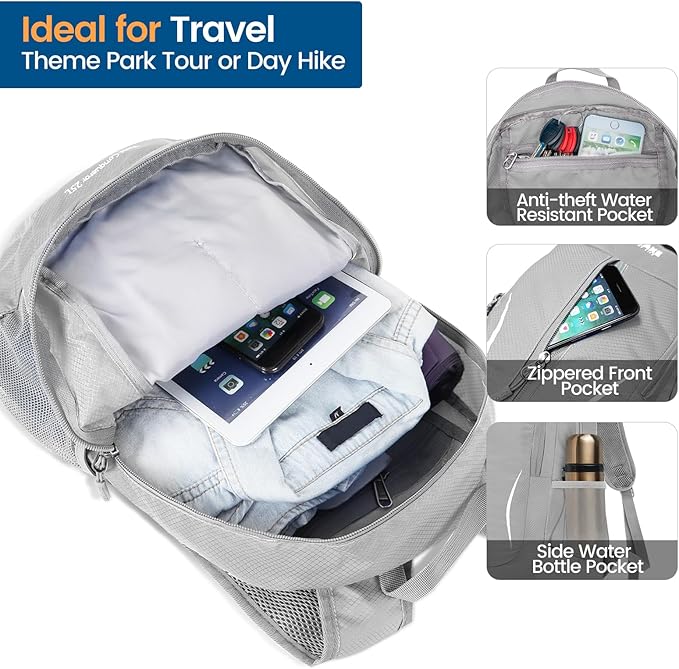 ZOMAKE Ultra Lightweight Packable Backpack 25L, Foldable Hiking Backpacks Water Resistant Small Folding Daypack for Travel(Sliver Grey)
