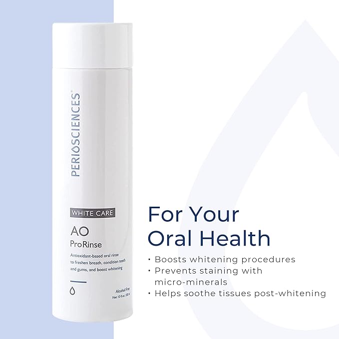 - For your oral health - PerioSciences AO ProRinse White Care Oral Rinse boosts whitening procedures and prevents staining with micro-minerals. This antioxidant-based mouthwash also freshens breath, supports your saliva’s natural defenses and helps calm tissues post whitening.