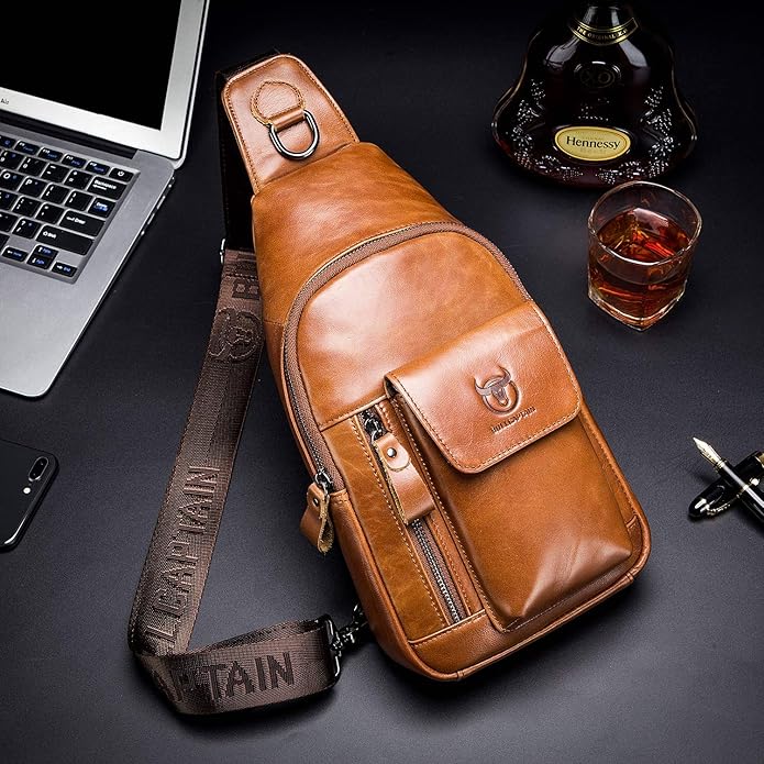 BULLCAPTAIN Mens Leather Crossbody Bag Shoulder Sling Bag Casual Daypacks Chest Bags for Travel Hiking Backpacks