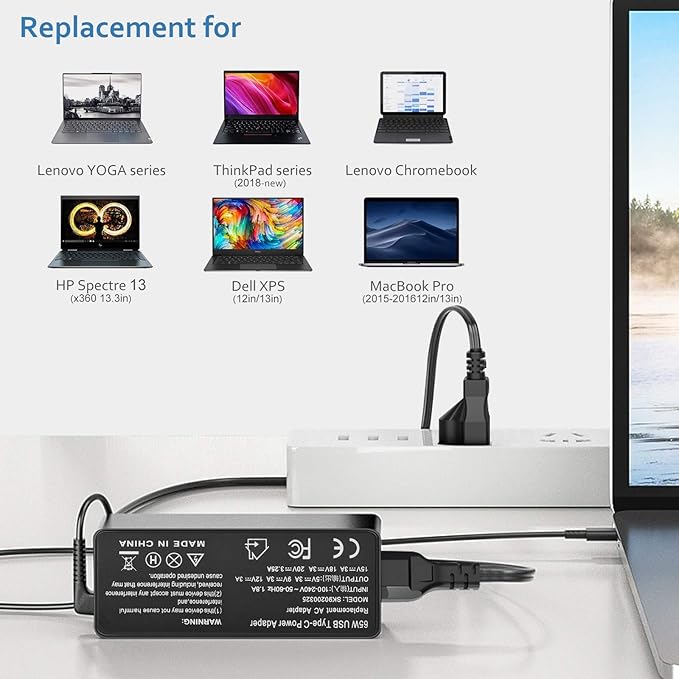 - What’s Included: Package includes 1 x 65W USB-C AC Adapter and 1 x Power Cord. Whether you need a replacement charger or a backup, this set provides everything you need to keep your laptop and other USB-C devices powered up.