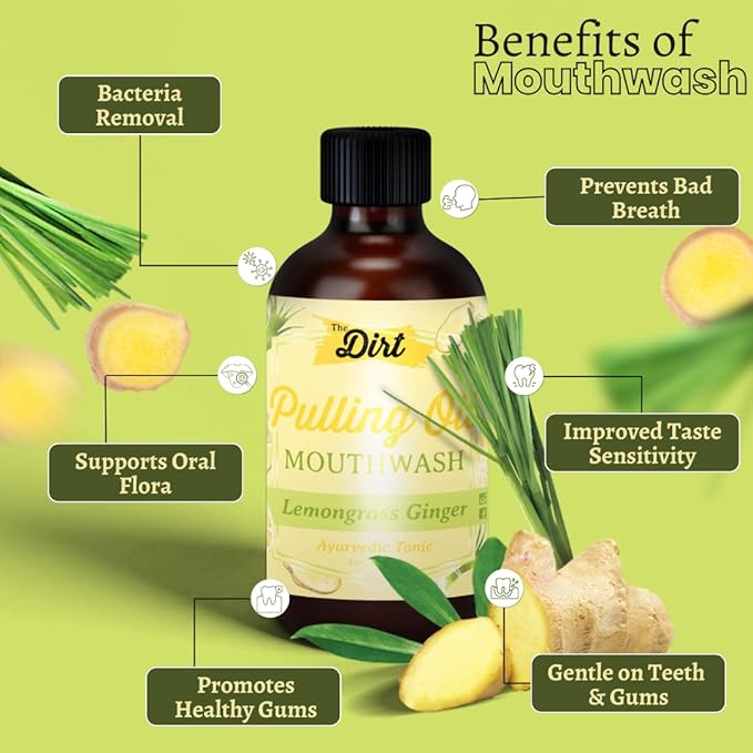 THE DIRT Oil Pulling Mouthwash - Gluten Free - Removes Plaque, Tartar, Bad Breath & Whitens Teeth (Lemongrass & Ginger, 4 Ounce)