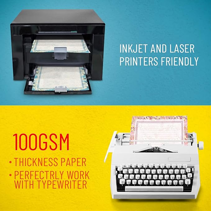 - Printer-friendly & luxurious quality: stationary paper is compatible with both inkjet and laser printers and also compatible with fountain pens or gel pens without bleeding and ghosting. Luxury quality with a moderate price. Paper is on smooth finished recycled paper.