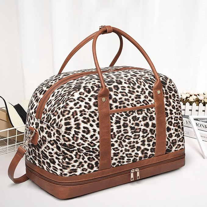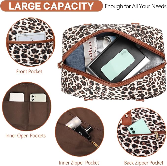 - 【Perfect Weekend Bag】19(length) x 13(height) x 9.5(width) inches--The large and spacious weekender bag is created with premium quality canvas and soft, brown faux leather accents.Durable and not easy to wear, Simpler and more stylish in appearance.