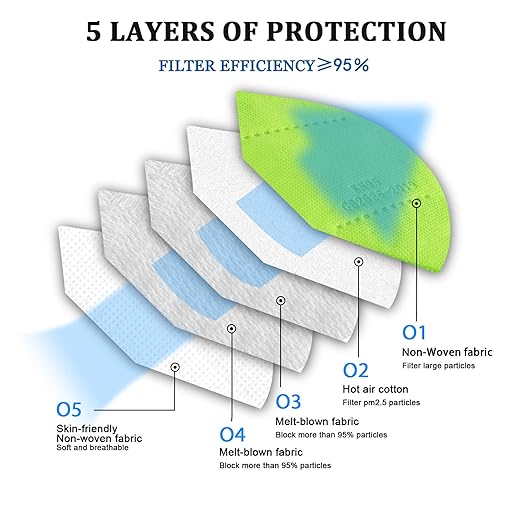 Akgk KN95 Face Mask 50 PCS, Breathable Protection 5-Ply Green Masks, Cup Dust Safety