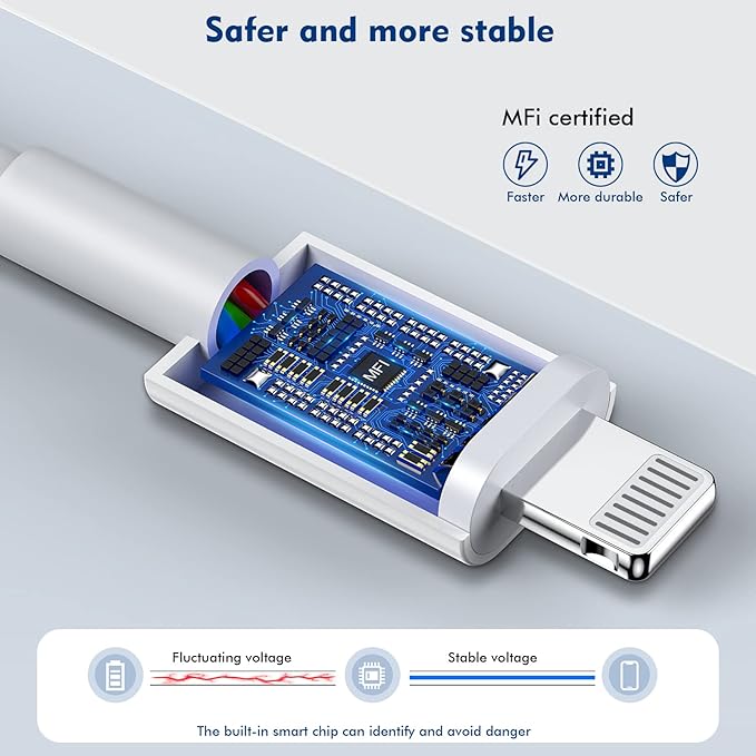 - [Apple Approved MFi Certified] Apple MFi Certified charging cable can charge your Apple iPhone 100% without error pop-up warning messages. During charging, the Apple iPhone charger cable will be cut off immediately when the voltage output is abnormal to ensure safety