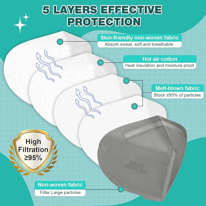 - 【Compliance & Security】Executive Standard: GB2626-2019. The filter efficiency of this KN95 mask is greater than 95% with 5 layer protection which is tested by NPPTL. Make sure to discard the face mask when it becomes visibily ditry or breathing resistance increases remarkably.