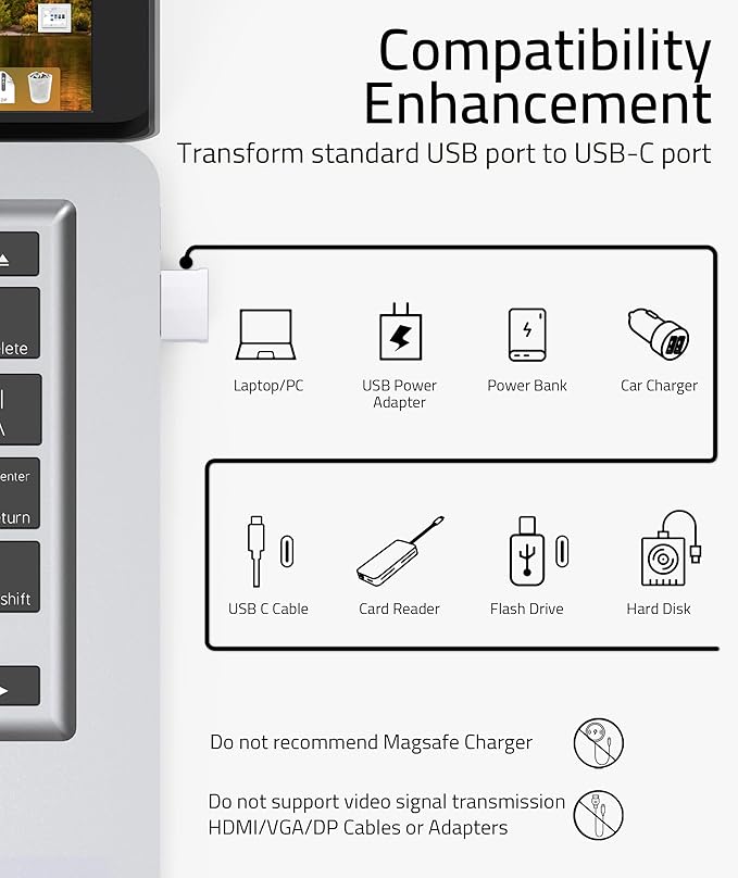 - Universal Compatibility: Turning USB ports into USB-C ports to connect USB-C peripherals to devices with USB-A ports built-in. This USB C adapter enables you to connect phones, tablets, flash drives, mice, hubs and other USB-C devices to your laptops and chargers with normal USB ports