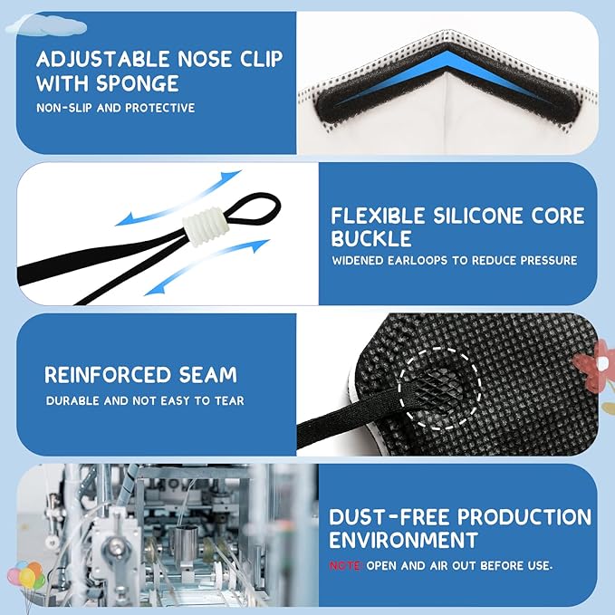 - SKIN-FRIENDLY & NON-BURDEN: The kids face mask use skin-friendly non-woven fabric, no irritation to your kid’s skin; Upgraded high-elastic ear loops make our child kn95 masks fit your child's face perfectly and no strain of ears. Moreover, the adjustable nose clip with sponge and 3D shape design provides child with a good seal around the edge and offers sufficient breathing space, ensuring all-round safety protection and comfortable wearing experience for kids.