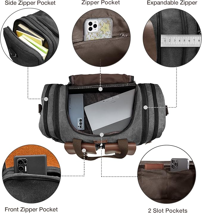 Wildroad 50L Travel Duffel Bag, Expandable Canvas Genuine Leather Duffle Bag Upgraded Overnight Weekender Carry on Bag