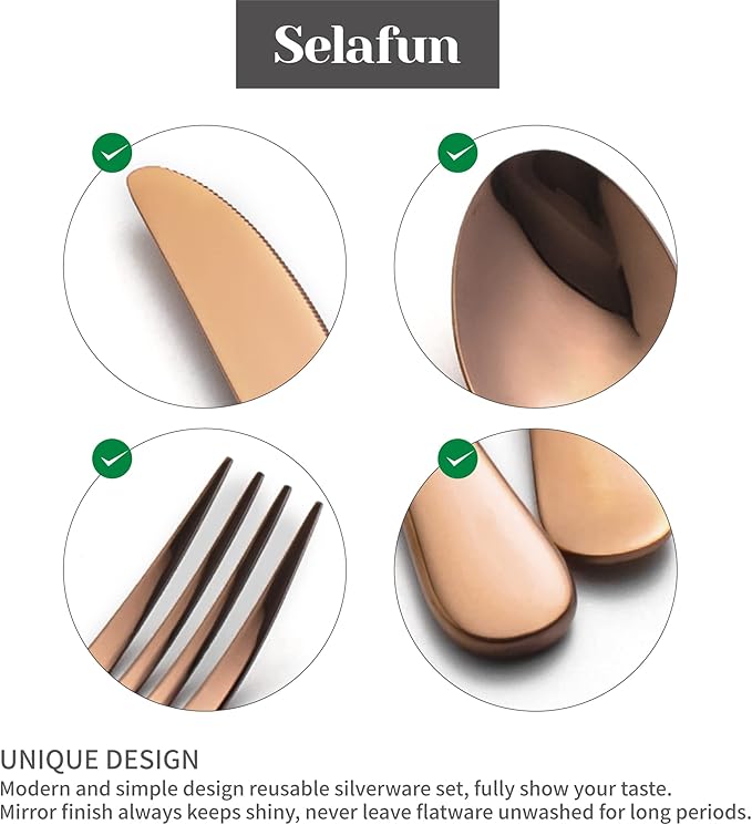 - UNIQUE DESIGN - Modern and simple mirror design reusable silverware set, fully show your taste. Mirror finish always keeps shiny, never leave flatware unwashed for long periods.