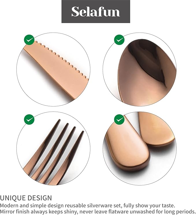 - UNIQUE DESIGN - Modern and simple mirror design reusable silverware set, fully show your taste. Mirror finish always keeps shiny, never leave flatware unwashed for long periods.