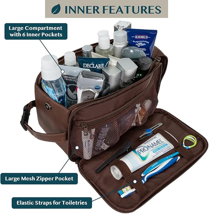 - MENS TOILETRY BAG: This functional PU leather toiletry travel bag has a large compartment and side pockets with additional pockets to hold all your toiletry, shaving, and grooming accessories. Equipped with elastic bands and additional mesh pockets to keep your hygiene items secured while traveling or at home, this cosmetic make up case will help you stay organized.