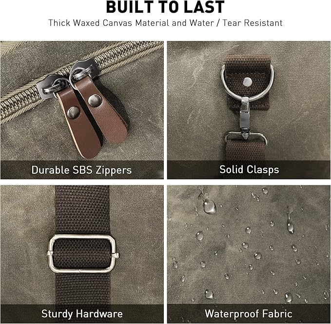 - 【Vintage Style】This duffle bag is made of waterproof durable waxed canvas, high quality leather, sturdy hardware and smooth strong SBS zippers. It is retro and stylish and can be used as a handbag. Padded handle for comfortable carrying. No need to worry about quality. This overnight bag also features a large durable adjustable shoulder strap for hands-free use.