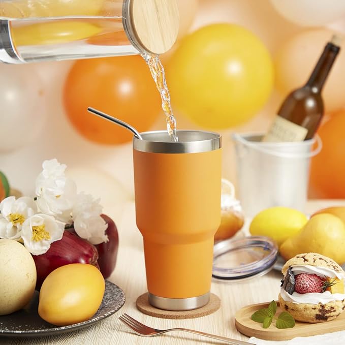 - MATERIAL DURABILITY:18/8 food grade stainless steel body,NO BPA, healthier than plastic cup. The insulated tumbler never sweat due to the Vacuum insulated design. Powder coating on the outside fits more comfortably in your hand, looks good, anti-slip