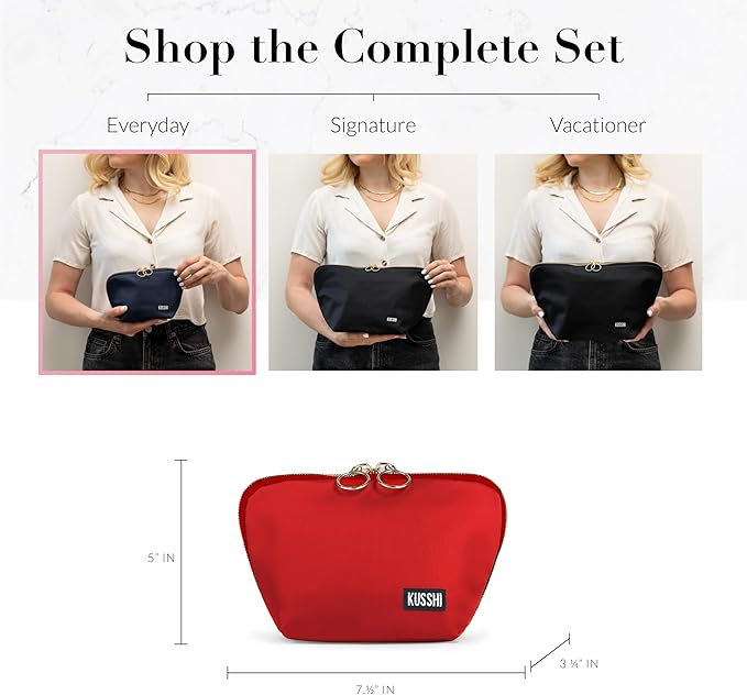- Everyday Makeup Bag – This small makeup bag is perfect for on the go: keep your toiletries, cosmetics, and skincare organized and secure. The bag provides effortless organization for your everyday essentials, it holds 5-10 products and measures 7.5” x 5”. Bring your must-haves wherever you go!