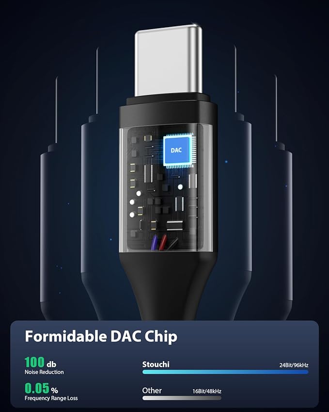 - 【Adapt Audio DAC】: USB C to aux adapter built-in audio DAC Noise Reduction Chip. With low-power, high-resolution multi-core hardware codecs and audio software technologies enable differentiated headsets for premium audio and voice experiences.