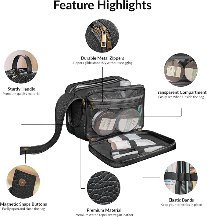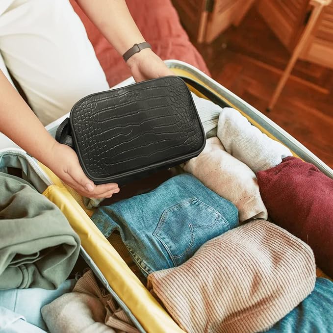 Dot&Dot Leather Toiletry Bag for Men Women - Spacious Womens Mens Toiletry Travel Bag, Large Travel Toiletries Bags (Black Croc, Large)