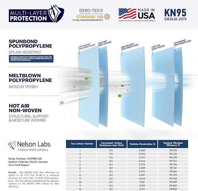 - [Superior Protection & Breathability] BNX’s 5-layer filtration technology provides maximum protection, comfort and breathability. The active filter layer is composed of ultra-high grade electrostatically charged meltblown polypropylene (top shelf highest grade material available in terms in breathability and protection). Extremely breathable up to 50%+ more breathable than leading competitors.