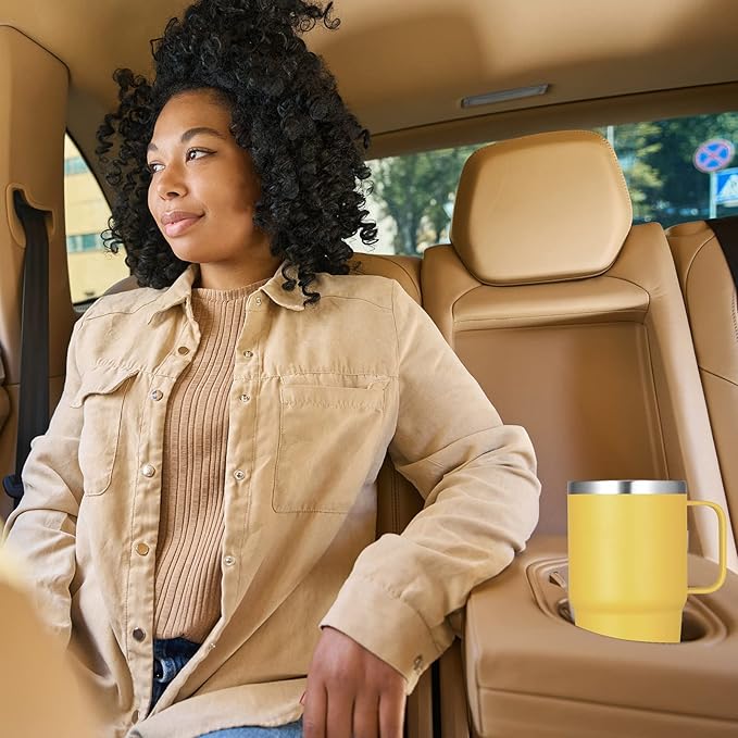 - Cupholder Friendly: The travel coffee tumbler 20oz is designed with a tapered shape which fits most car cup holders, equipped with a sturdy handle that allows easy carrying. Diameter 3.38" large cup mouth makes it easier for you to clean the stainless steel mug