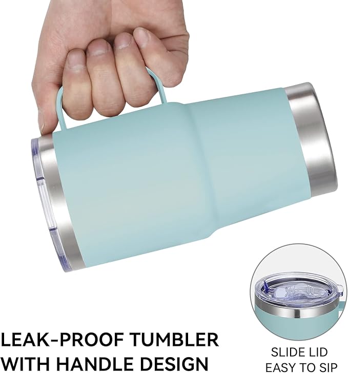 - Stainless Steel Tumblers with Handle: Made of 304 18/8 stainless steel,it won't retain or transfer flavors with the electro polished inside and also sweat proof with colorful powder coating outside. 360-degree welded handle gives you a firm grip on your beverage