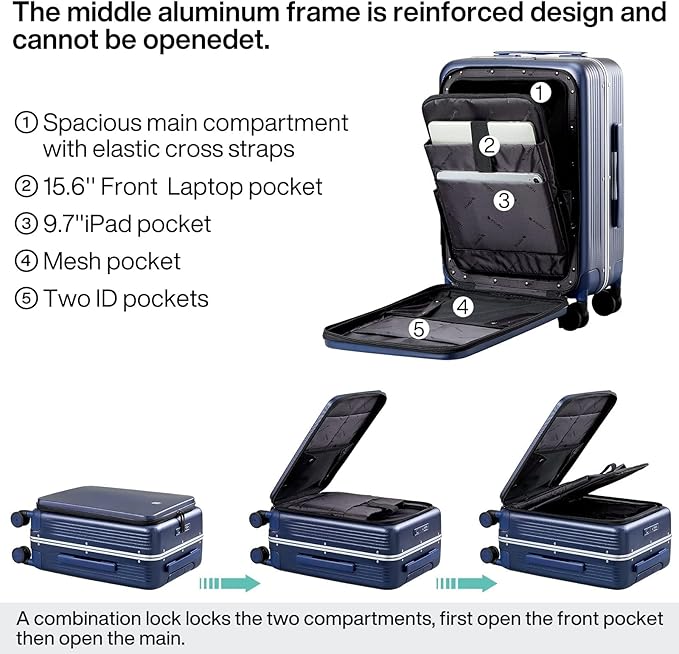 - 【Elegant Short Travel】A multi in one hardshell luggage designed specifically for short business trips, front opening can quick access to laptop, easy to pass airport security checks. Shoulders no longer need to carry heavy backpacks, made your flights so much easier.(Not clamshell opening method,the middle aluminum frame cannot be opened.)