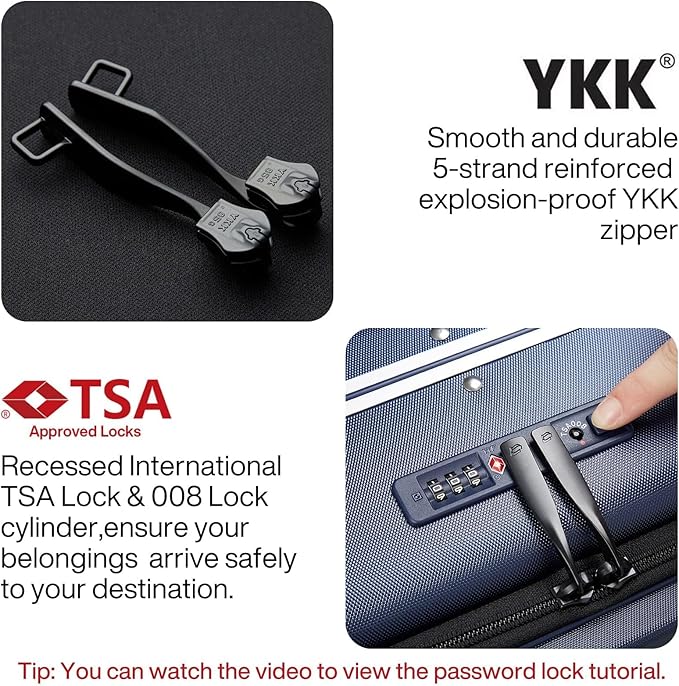 - 【Spinner wheels and Travel locks】The hard sided luggage with spinner wheels with rotating wheels that are very durable, quiet, and have strong load-bearing capacity. It can be easily operated on different roads such as cobblestone and carpet roads;The travel approved carry on luggage can protect the security of electronic products and undergo non-destructive safety checks, making it more convenient and secure.