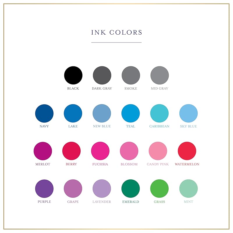 - PRINTING Choose from 20 ink colors. See color chart for options. The print is flat, crisp and clear.
