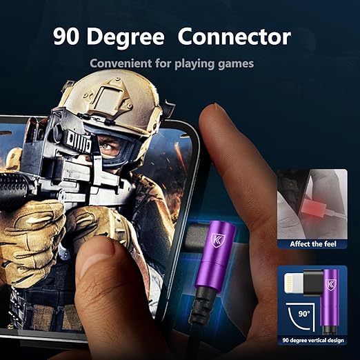 - 90 Degree iPhone Charger Cable: The 90 degree lightning cable 10ft comes with L shapes connections (Lightning end), which can fit the device sideways. 90 degree extra long 10 FT iPhone charger cord is more convenient for playing games, watching video when you while charging.
