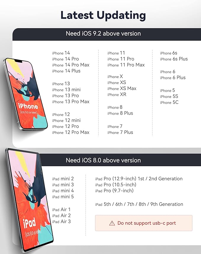 - 【Fubiaofei Advantage】 Unlike the general USB for iPhone adapter, Fubiaofei iPhone to USB adapter supports Hard disk drive, other USB peripherals like USB flash disk, trail gamecam, hubs, audio/midi interfaces, ethernet adapters etc. Compatible with all iPhone with iOS 9.2 and up and iPads with iOS 8.0 or later.