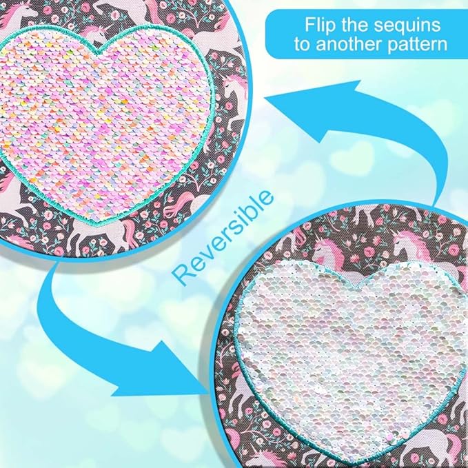 - Unique Design: This little girls backpack is designed with unique unicorn patterns and the love heart shape was used glitter sequins from the front pouch. On the front of this school bag, there is an adjustable strap with a side-release buckle that allows kids to conveniently attach a lunch bag or jacket, hats, doll and so on.